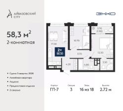 Продается 2-комн. квартира от застройщика с предчистовой отделкой в ЖК "Айвазовский City" на 16 этаже. Общая площадь: 58.3 кв.м., жилая: 22.9 кв.м., площадь просторной кухни-столовой: 17.3 кв.м. Комнаты изолированные, все окна выходят на одну сторону. В квартире одна лоджия, два совмещенных санузла. Высота потолков 2.72 м.