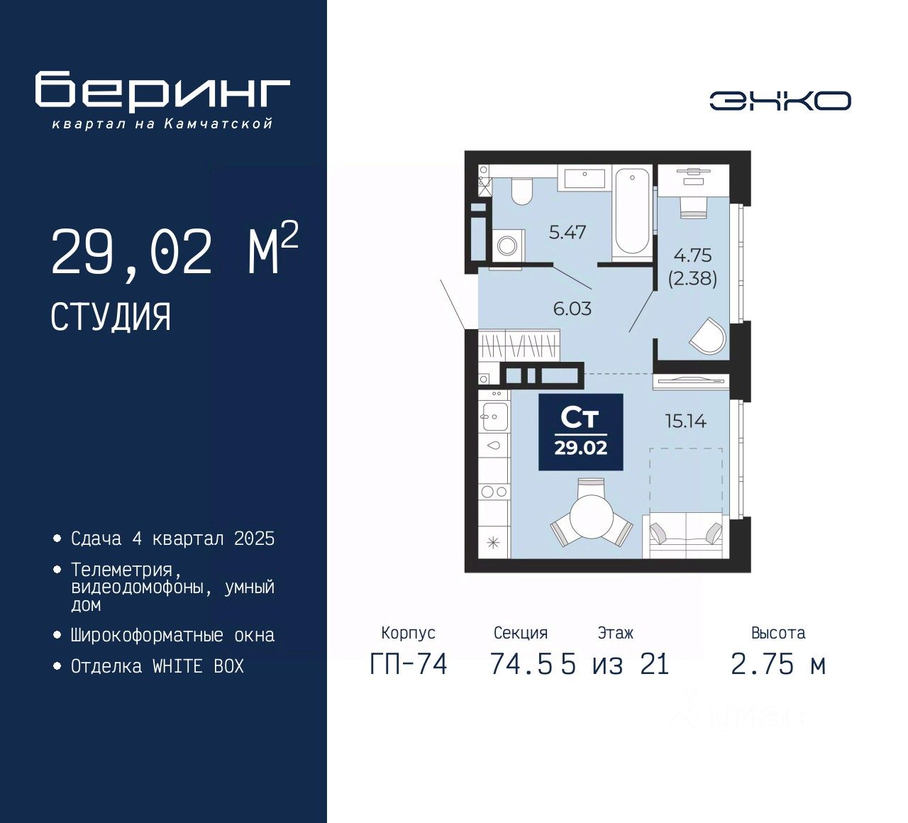 1-комн. квартира-студия от застройщика в ЖК "Беринг" на 5 этаже. Квартира без отделки, после оформления собственности можно делать ремонт. Общая площадь: 29.02 кв.м., площадь гостиной 15.14 кв.м., из которых 5 кв.м. выделено под кухонную зону. Все окна выходят на одну сторону. В квартире один совмещенный санузел. Высота потолков 2.75 м.