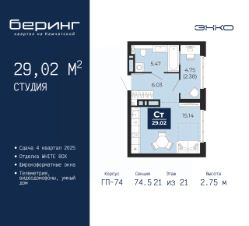 1-комн. квартира-студия от застройщика в ЖК "Беринг" на 21 этаже. Квартира без отделки, после оформления собственности можно делать ремонт. Общая площадь: 29.02 кв.м., площадь гостиной 15.14 кв.м., из которых 5 кв.м. выделено под кухонную зону. Все окна выходят на одну сторону. В квартире один совмещенный санузел. Высота потолков 2.75 м.