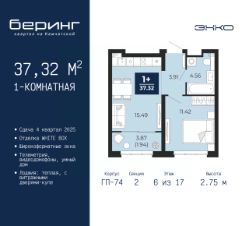 1-комн. квартира в ЖК "Беринг" на 6 этаже. Квартира без отделки, после оформления собственности можно делать ремонт. Общая площадь: 37.32 кв.м., жилая: 11.42 кв.м., площадь просторной кухни-столовой: 15.49 кв.м. Все окна выходят на одну сторону. В квартире одна лоджия, один совмещенный санузел. Высота потолков 2.75 м.