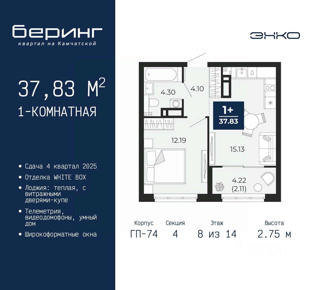 Просторная 1-комн. квартира в ЖК "Беринг" на 8 этаже. Квартира без отделки, полностью готова к чистовой отделке и дальнейшему ремонту. Общая площадь: 37.83 кв.м., жилая: 12.19 кв.м., площадь просторной кухни-столовой: 15.13 кв.м. Все окна выходят на одну сторону. В квартире одна лоджия, один совмещенный санузел. Высота потолков 2.75 м.