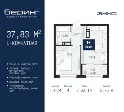 Продается 1-комн. квартира в ЖК "Беринг" на 7 этаже. Квартира без отделки, после получения ключей можно делать ремонт. Общая площадь: 37.83 кв.м., жилая: 12.19 кв.м., площадь просторной кухни-столовой: 15.13 кв.м. Все окна выходят на одну сторону. В квартире одна лоджия, один совмещенный санузел. Высота потолков 2.75 м.