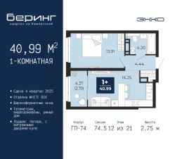 Продается однокомнатная квартира от застройщика в ЖК "Беринг" на 12 этаже. Квартира без отделки, новый собственник может сделать ремонт по индивидуальному проекту. Общая площадь: 40.99 кв.м., жилая: 13.91 кв.м., площадь просторной кухни-столовой: 16.25 кв.м. Все окна выходят на одну сторону. В квартире одна лоджия, один совмещенный санузел. Высота потолков 2.75 м.