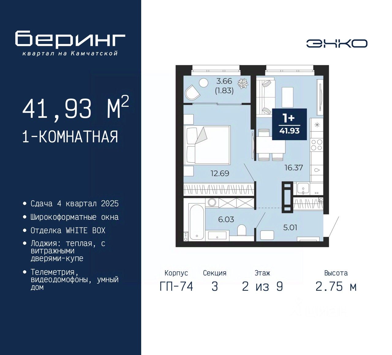 Продается 1-комн. квартира от застройщика в ЖК "Беринг" на 2 этаже. Квартира без отделки, новый владелец может сделать ремонт по своему проекту. Общая площадь: 41.93 кв.м., жилая: 12.69 кв.м., площадь просторной кухни-столовой: 16.37 кв.м. Все окна выходят на одну сторону. В квартире одна лоджия, один совмещенный санузел. Высота потолков 2.75 м.