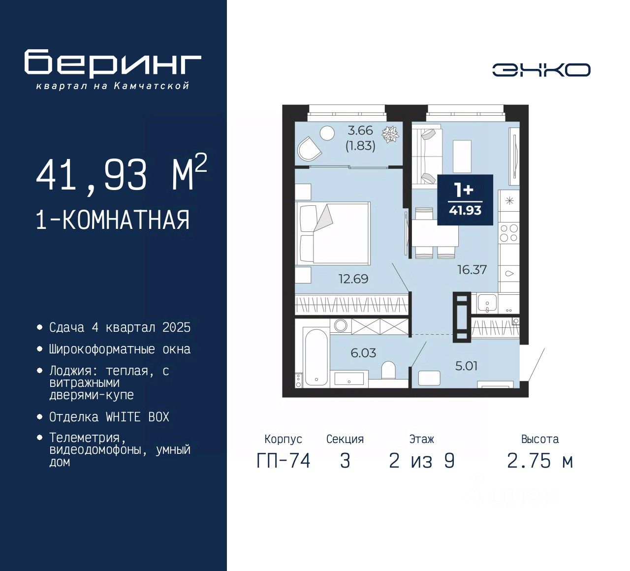Однокомнатная квартира от застройщика в ЖК "Беринг" на 2 этаже. Квартира без отделки, полностью готова к чистовой отделке и дальнейшему ремонту. Общая площадь: 41.93 кв.м., жилая: 12.69 кв.м., площадь просторной кухни-столовой: 16.37 кв.м. Все окна выходят на одну сторону. В квартире одна лоджия, один совмещенный санузел. Высота потолков 2.75 м.
