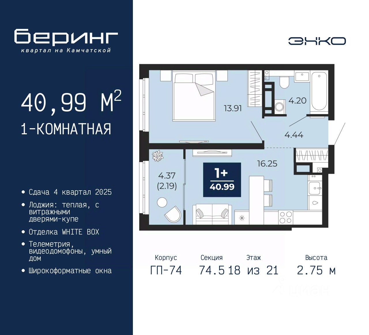 1-комн. квартира от застройщика в ЖК "Беринг" на 18 этаже. Квартира без отделки, полностью готова к ремонту. Общая площадь: 40.99 кв.м., жилая: 13.91 кв.м., площадь просторной кухни-столовой: 16.25 кв.м. Все окна выходят на одну сторону. В квартире одна лоджия, один совмещенный санузел. Высота потолков 2.75 м.