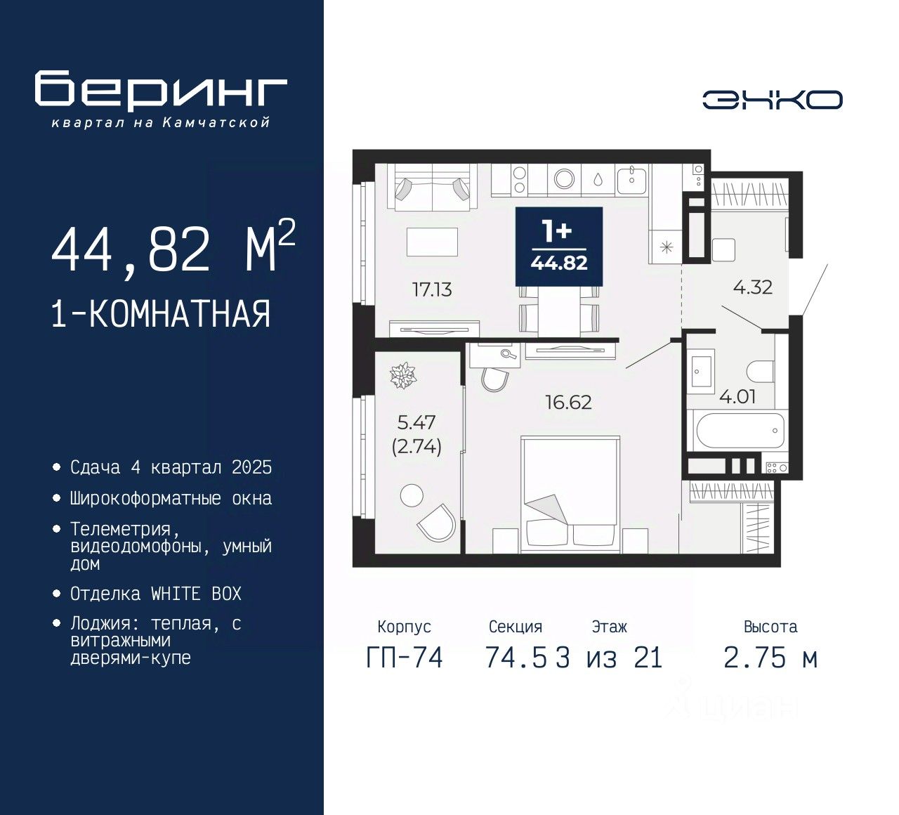 Просторная однокомнатная квартира в ЖК "Беринг" на 3 этаже. Квартира без отделки, полностью готова к ремонту. Общая площадь: 44.82 кв.м., жилая: 16.62 кв.м., площадь просторной кухни-столовой: 17.13 кв.м. Все окна выходят на одну сторону. В квартире одна лоджия, один совмещенный санузел. Высота потолков 2.75 м.