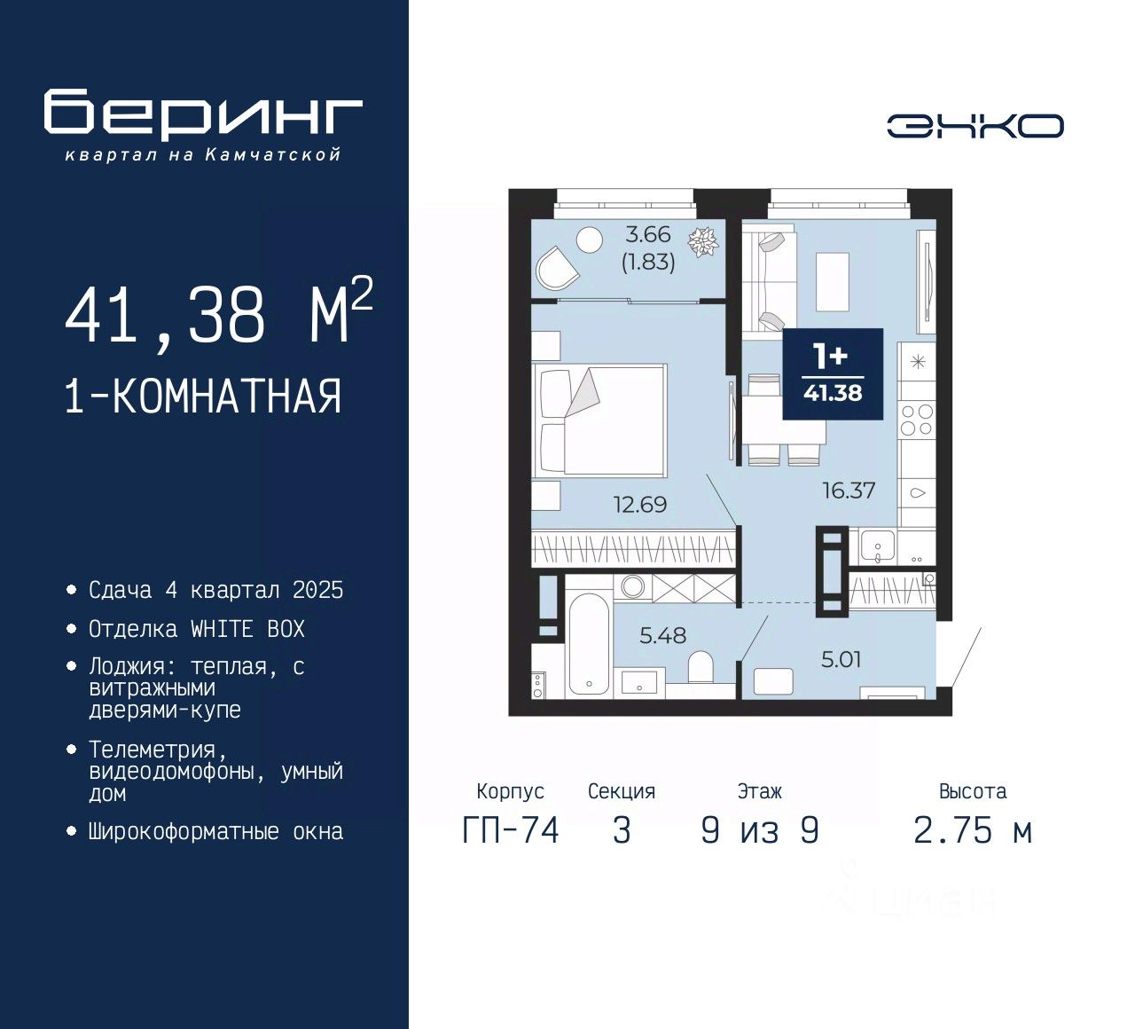 Просторная 1-комн. квартира в ЖК "Беринг" на 9 этаже. Квартира без отделки, после оформления собственности можно делать ремонт. Общая площадь: 41.38 кв.м., жилая: 12.69 кв.м., площадь просторной кухни-столовой: 16.37 кв.м. Все окна выходят на одну сторону. В квартире одна лоджия, один совмещенный санузел. Высота потолков 2.75 м.