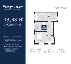2-комн. квартира в ЖК "Беринг" на 16 этаже. Квартира без отделки, полностью готова к ремонту. Общая площадь: 48.48 кв.м., жилая: 22.47 кв.м., площадь просторной кухни-столовой: 11.67 кв.м. Квартира угловая, окна oбecпeчивaют paвнoмepнoe ocвeщeниe в тeчeниe дня. В квартире одна лоджия, один совмещенный санузел. Высота потолков 2.75 м.