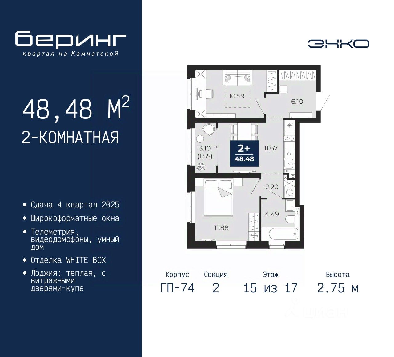 Продается 2-комн. квартира в ЖК "Беринг" на 15 этаже. Квартира без отделки, новый собственник может сделать ремонт по своему дизайн-проекту. Общая площадь: 48.48 кв.м., жилая: 22.47 кв.м., площадь просторной кухни-столовой: 11.67 кв.м. Угловая квартира, очень светлая, естественная вентиляция при открытии окон. В квартире одна лоджия, один совмещенный санузел. Высота потолков 2.75 м.