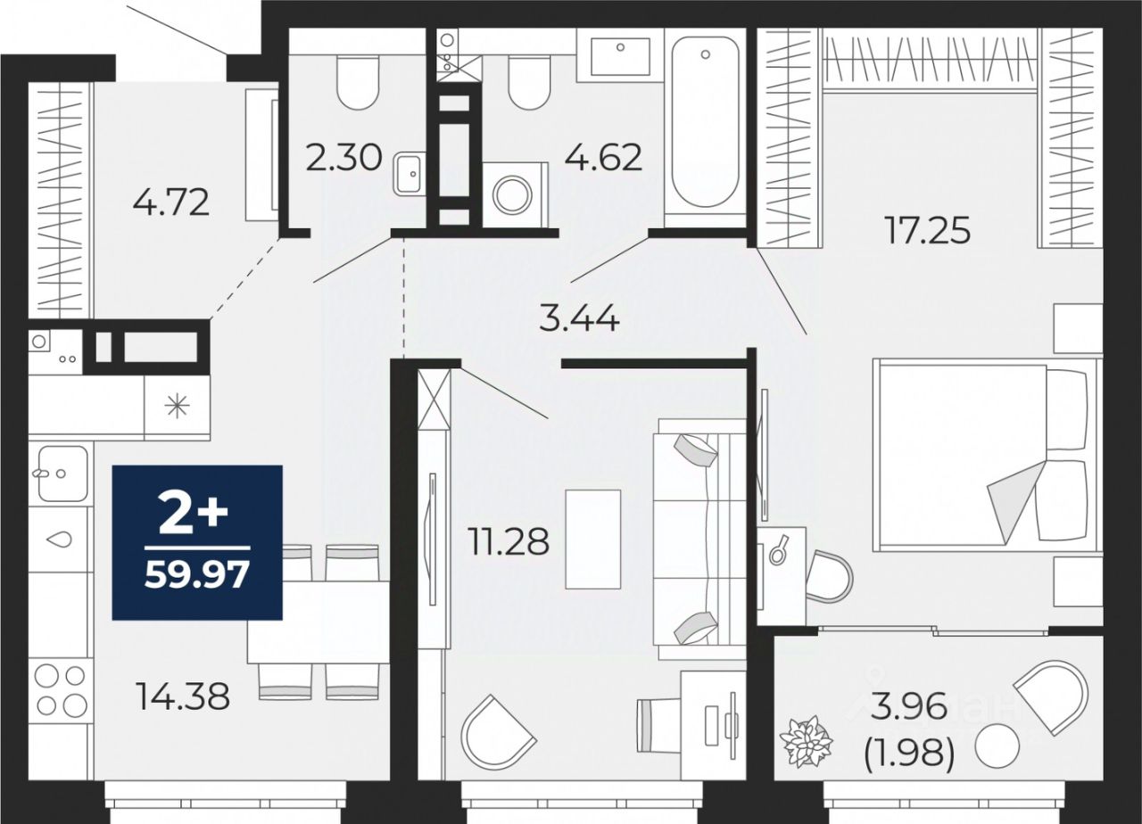 Просторная 2-комн. квартира в ЖК "Беринг" на 7 этаже. Квартира без отделки, полностью готова к ремонту. Общая площадь: 59.97 кв.м., жилая: 28.53 кв.м., площадь просторной кухни-столовой: 14.38 кв.м. Комнаты изолированные, все окна выходят на одну сторону. В квартире одна лоджия, один совмещенный и один раздельный санузел. Высота потолков 2.75 м.