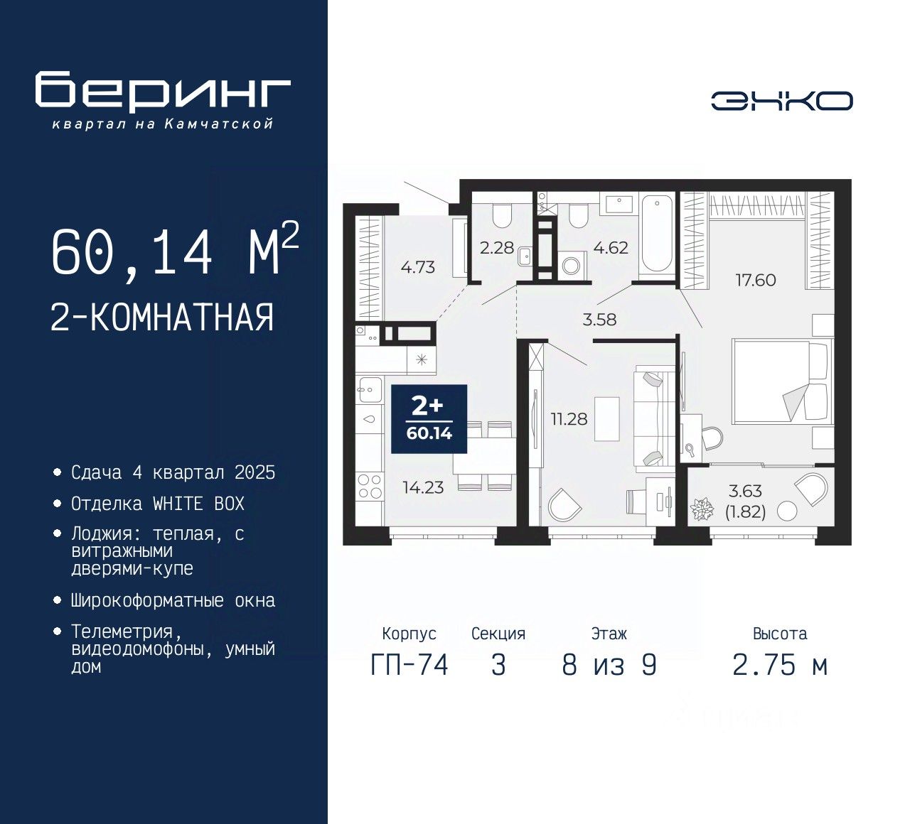 2-комн. квартира от застройщика в ЖК "Беринг" на 8 этаже. Квартира без отделки, полностью готова к ремонту. Общая площадь: 60.14 кв.м., жилая: 28.88 кв.м., площадь просторной кухни-столовой: 14.23 кв.м. Комнаты изолированные, все окна выходят на одну сторону. В квартире одна лоджия, один совмещенный и один раздельный санузел. Высота потолков 2.75 м.