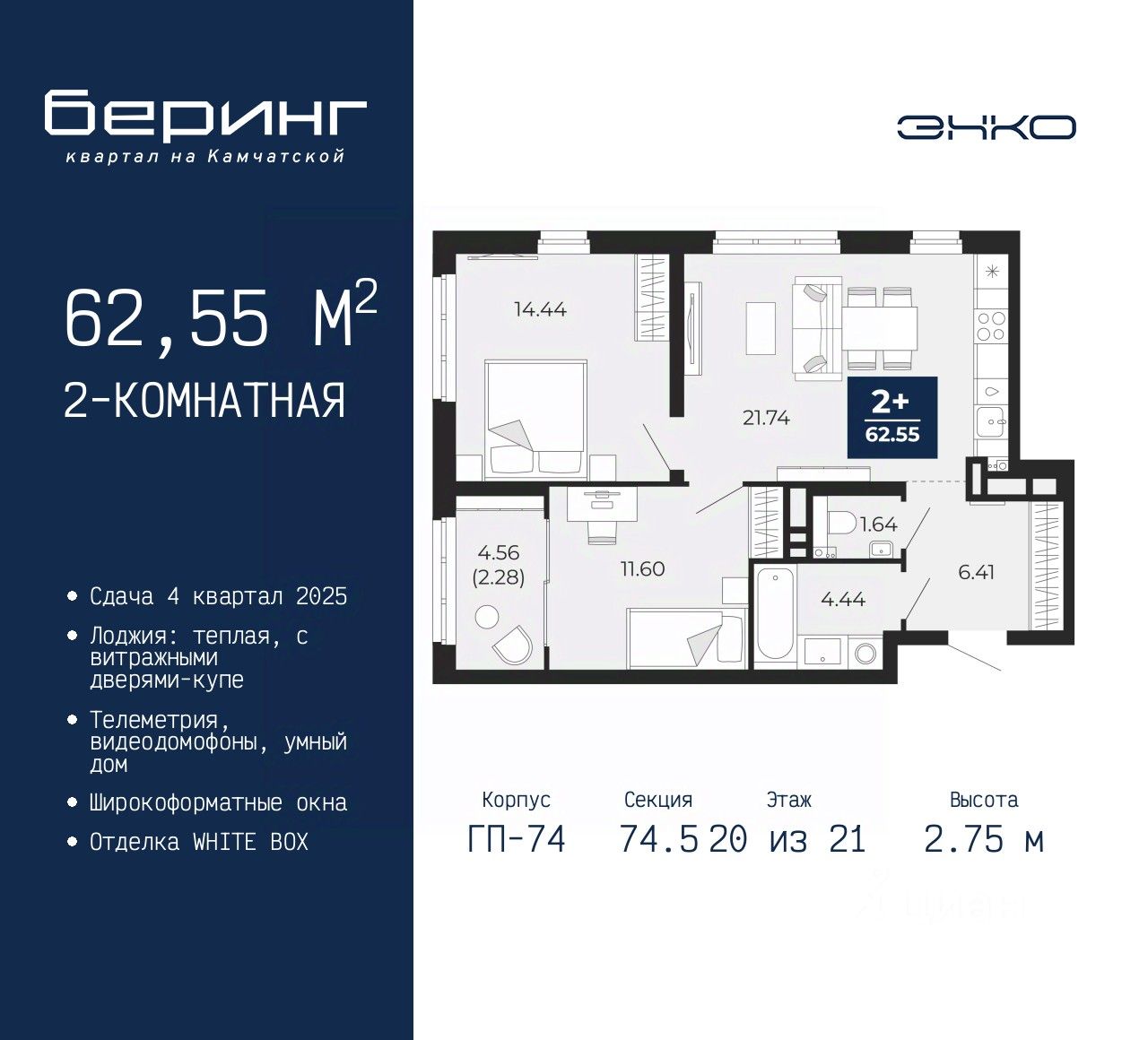 2-комн. квартира от застройщика в ЖК "Беринг" на 20 этаже. Квартира без отделки, полностью готова к чистовой отделке и дальнейшему ремонту. Общая площадь: 62.55 кв.м., жилая: 26.04 кв.м., площадь просторной кухни-столовой: 21.74 кв.м. Квартира угловая, очень светлая, естественная вентиляция при открытии окон. В квартире одна лоджия, один раздельный санузел. Высота потолков 2.75 м.