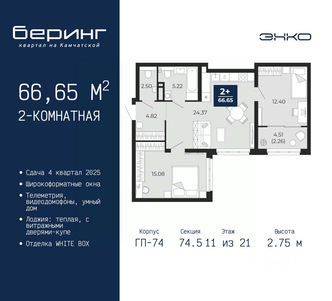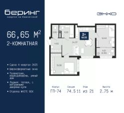 2-комн. квартира в ЖК "Беринг" на 11 этаже. Квартира без отделки, полностью готова к ремонту. Общая площадь: 66.65 кв.м., жилая: 27.48 кв.м., площадь просторной кухни-столовой: 24.37 кв.м. Квартира угловая, идеально подойдет любителям тишины и панорамных видов. В квартире одна лоджия, один совмещенный и один раздельный санузел. Высота потолков 2.75 м.