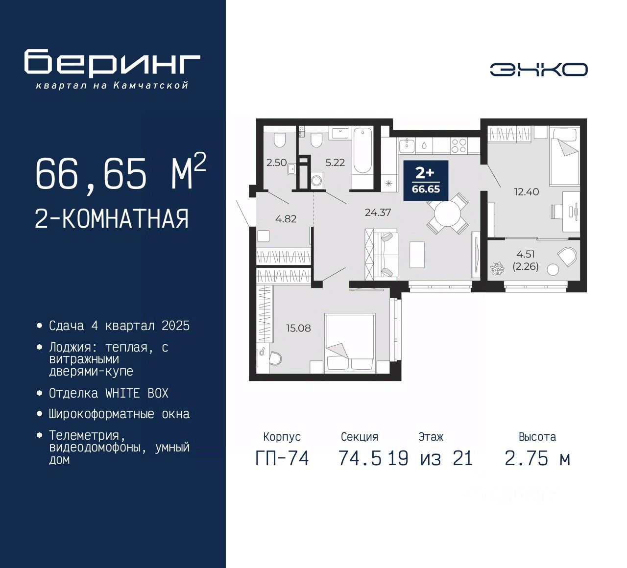 Двухкомнатная квартира от застройщика в ЖК "Беринг" на 19 этаже. Квартира без отделки, полностью готова к ремонту. Общая площадь: 66.65 кв.м., жилая: 27.48 кв.м., площадь просторной кухни-столовой: 24.37 кв.м. Квартира угловая, окна oбecпeчивaют paвнoмepнoe ocвeщeниe в тeчeниe дня. В квартире одна лоджия, один совмещенный и один раздельный санузел. Высота потолков 2.75 м.