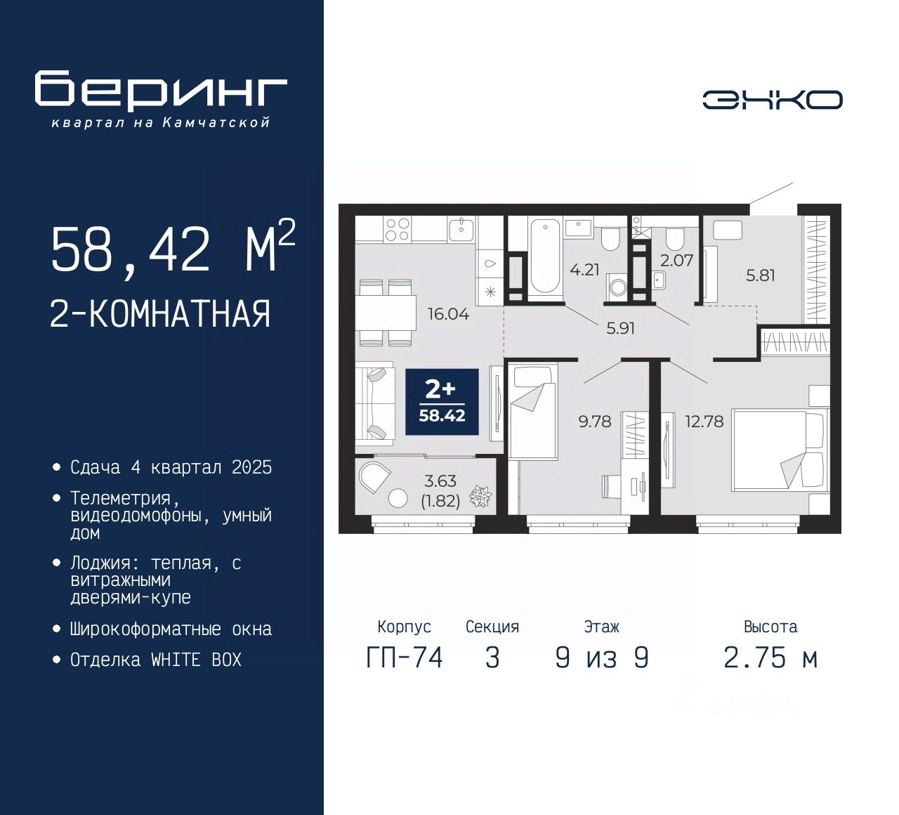 Двухкомнатная квартира от застройщика в ЖК "Беринг" на 9 этаже. Квартира без отделки, после выдачи ключей можно делать ремонт. Общая площадь: 58.42 кв.м., жилая: 22.56 кв.м., площадь просторной кухни-столовой: 16.04 кв.м. Комнаты изолированные, все окна выходят на одну сторону. В квартире одна лоджия, один совмещенный и один раздельный санузел. Высота потолков 2.75 м.