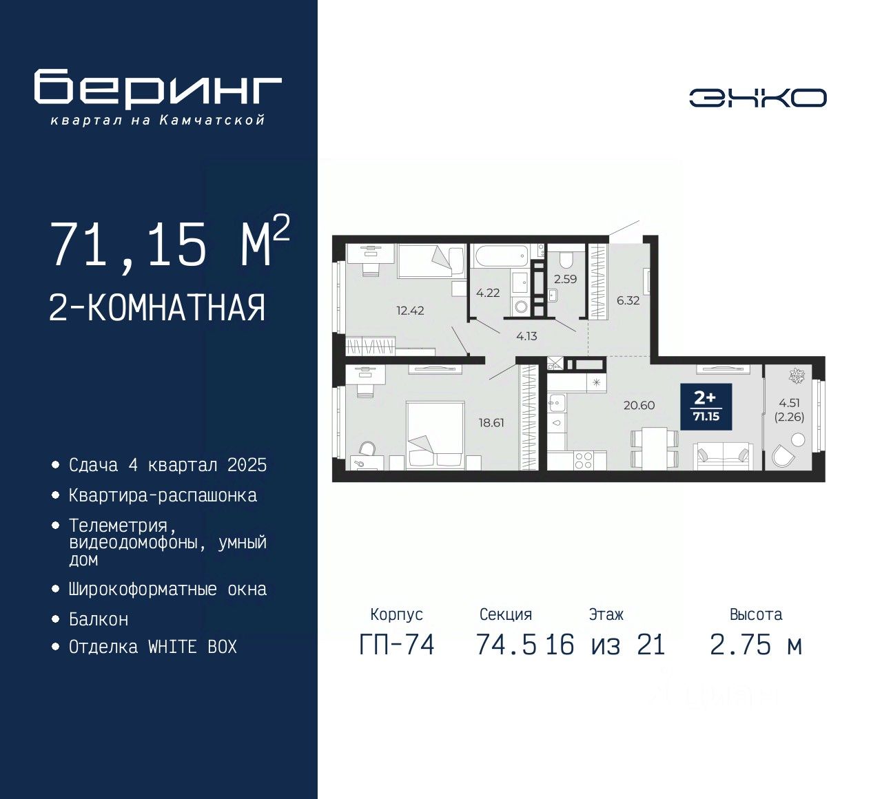 Двухкомнатная квартира в ЖК "Беринг" на 16 этаже. Квартира без отделки, новый владелец может сделать ремонт по своему проекту. Общая площадь: 71.15 кв.м., жилая: 31.03 кв.м., площадь просторной кухни-столовой: 20.6 кв.м. Квартира - распашонка, без проходных комнат, окна выходят на paзные стороны дома. В квартире один балкон, один раздельный санузел. Высота потолков 2.75 м.