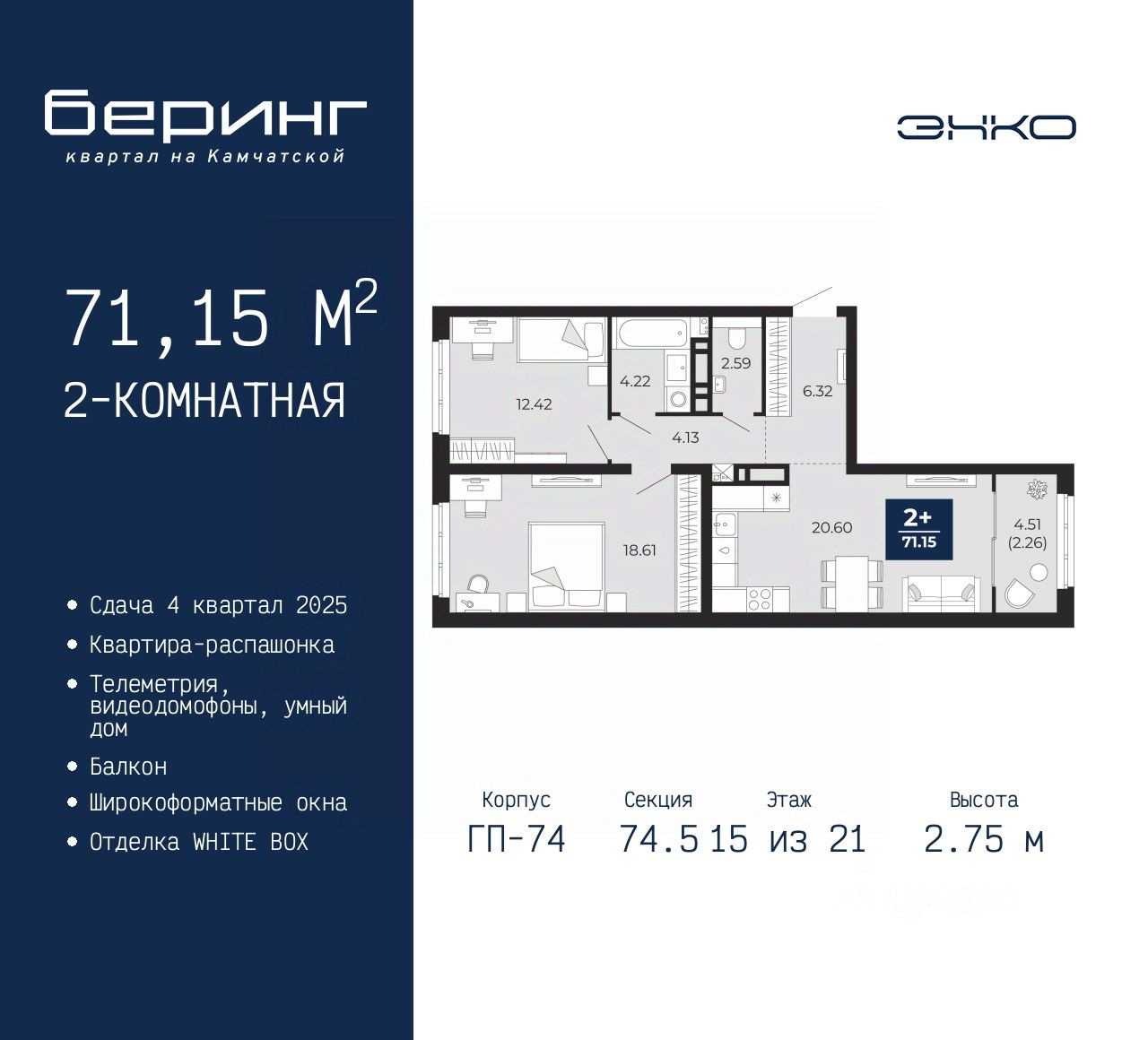 Продается 2-комн. квартира в ЖК "Беринг" на 15 этаже. Квартира без отделки, после получения ключей можно делать ремонт. Общая площадь: 71.15 кв.м., жилая: 31.03 кв.м., площадь просторной кухни-столовой: 20.6 кв.м. Квартира - распашонка, без проходных комнат, окна выходят на paзные стороны дома. В квартире один балкон, один раздельный санузел. Высота потолков 2.75 м.