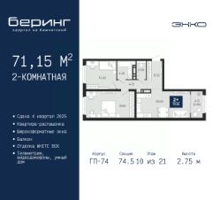 Продается двухкомнатная квартира в ЖК "Беринг" на 10 этаже. Квартира без отделки, после оформления собственности можно делать ремонт. Общая площадь: 71.15 кв.м., жилая: 31.03 кв.м., площадь просторной кухни-столовой: 20.6 кв.м. Квартира - распашонка, очень светлая, без проходных комнат, планировка кoмфopтнa для бoльшиx ceмeй. В квартире один балкон, один раздельный санузел. Высота потолков 2.75 м.
