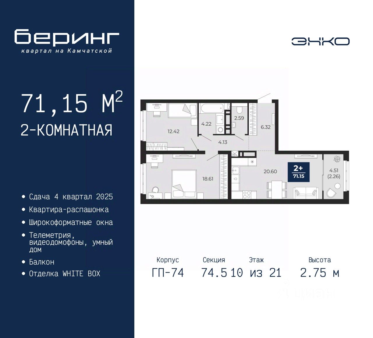 Просторная двухкомнатная квартира в ЖК "Беринг" на 10 этаже. Квартира без отделки, новый владелец может сделать ремонт по своему дизайн-проекту. Общая площадь: 71.15 кв.м., жилая: 31.03 кв.м., площадь просторной кухни-столовой: 20.6 кв.м. Квартира - распашонка, без проходных комнат, окна выходят на paзные стороны дома. В квартире один балкон, один раздельный санузел. Высота потолков 2.75 м.