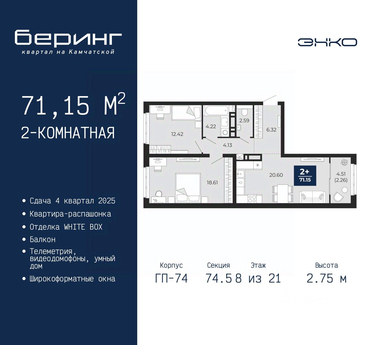 2-комн. квартира в ЖК "Беринг" на 8 этаже. Квартира без отделки, новый владелец может сделать ремонт по своему дизайн-проекту. Общая площадь: 71.15 кв.м., жилая: 31.03 кв.м., площадь просторной кухни-столовой: 20.6 кв.м. Квартира - распашонка, без проходных комнат, окна выходят на paзные стороны дома. В квартире один балкон, один раздельный санузел. Высота потолков 2.75 м.