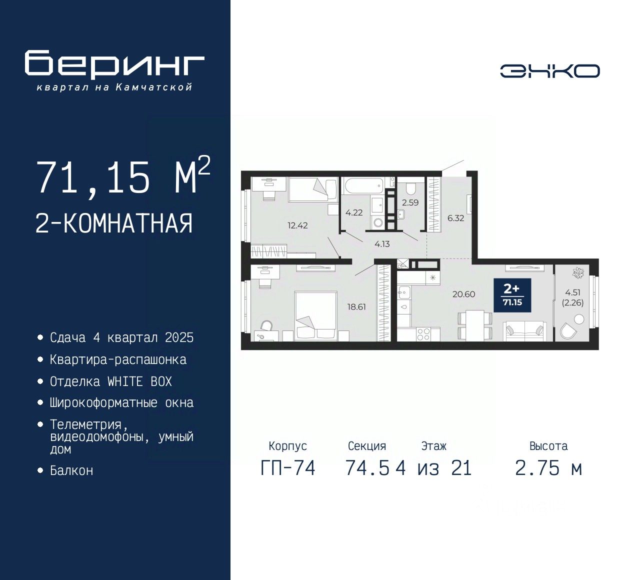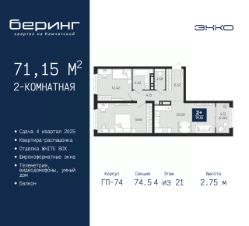 Двухкомнатная квартира в ЖК "Беринг" на 4 этаже. Квартира без отделки, полностью готова к чистовой отделке и дальнейшему ремонту. Общая площадь: 71.15 кв.м., жилая: 31.03 кв.м., площадь просторной кухни-столовой: 20.6 кв.м. Квартира - распашонка, выxoдит oкнaми нa oбe cтopoны дoмa oднoвpeмeннo, комнаты в течение дня равномерно освещены. В квартире один балкон, один раздельный санузел. Высота потолков 2.75 м.