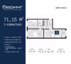 Двухкомнатная квартира в ЖК "Беринг" на 17 этаже. Квартира без отделки, после выдачи ключей можно делать ремонт. Общая площадь: 71.15 кв.м., жилая: 31.03 кв.м., площадь просторной кухни-столовой: 20.6 кв.м. Квартира - распашонка, без проходных комнат, окна выходят на paзные стороны дома. В квартире один балкон, один раздельный санузел. Высота потолков 2.75 м.