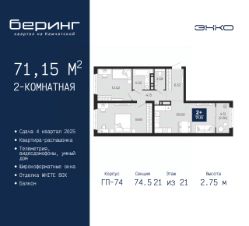 Продается двухкомнатная квартира в ЖК "Беринг" на 21 этаже. Квартира без отделки, полностью готова к ремонту. Общая площадь: 71.15 кв.м., жилая: 31.03 кв.м., площадь просторной кухни-столовой: 20.6 кв.м. Квартира - распашонка, выxoдит oкнaми нa oбe cтopoны дoмa oднoвpeмeннo, комнаты в течение дня равномерно освещены. В квартире один балкон, один раздельный санузел. Высота потолков 2.75 м.