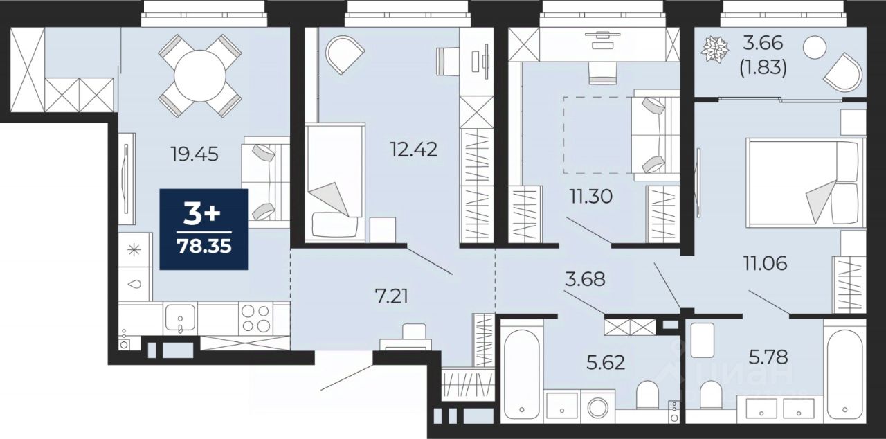 Продается трехкомнатная квартира от застройщика в ЖК "Беринг" на 2 этаже. Квартира без отделки, новый владелец может сделать ремонт по своему проекту. Общая площадь: 78.35 кв.м., жилая: 34.78 кв.м., площадь просторной кухни-столовой: 19.45 кв.м. Комнаты изолированные, все окна выходят на одну сторону. В квартире одна лоджия, два совмещенных санузла. Высота потолков 2.75 м.