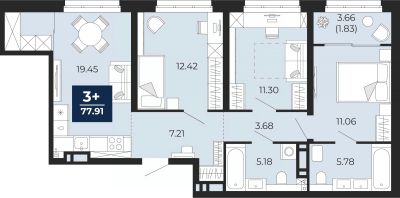 Просторная трехкомнатная квартира в ЖК "Беринг" на 4 этаже. Квартира без отделки, после оформления собственности можно делать ремонт. Общая площадь: 77.91 кв.м., жилая: 34.78 кв.м., площадь просторной кухни-столовой: 19.45 кв.м. Комнаты изолированные, все окна выходят на одну сторону. В квартире одна лоджия, два совмещенных санузла. Высота потолков 2.75 м.
