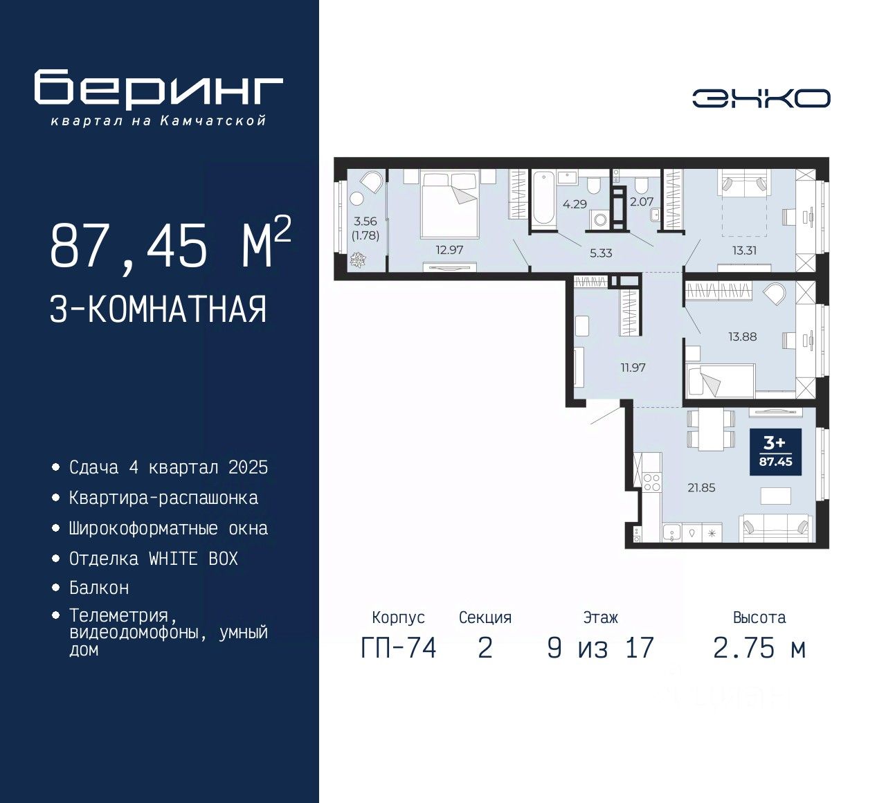 Трехкомнатная квартира от застройщика в ЖК "Беринг" на 9 этаже. Квартира без отделки, после оформления собственности можно делать ремонт. Общая площадь: 87.45 кв.м., жилая: 40.16 кв.м., площадь просторной кухни-столовой: 21.85 кв.м. Квартира - распашонка, без проходных комнат, окна выходят на paзные стороны дома. В квартире один балкон, один совмещенный и один раздельный санузел. Высота потолков 2.75 м.