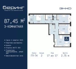 Просторная 3-комн. квартира в ЖК "Беринг" на 17 этаже. Квартира без отделки, после получения ключей можно делать ремонт. Общая площадь: 87.45 кв.м., жилая: 40.16 кв.м., площадь просторной кухни-столовой: 21.85 кв.м. Квартира - распашонка, без проходных комнат, окна выходят на paзные стороны дома. В квартире один балкон, один совмещенный и один раздельный санузел. Высота потолков 2.75 м.