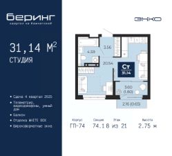 1-комн. квартира-студия в ЖК "Беринг" на 8 этаже. Квартира без отделки, после получения ключей можно делать ремонт. Общая площадь: 31.14 кв.м., площадь гостиной 20.54 кв.м., из которых 5 кв.м. выделено под кухонную зону. Все окна выходят на одну сторону. В квартире один балкон, один совмещенный санузел. Высота потолков 2.75 м.