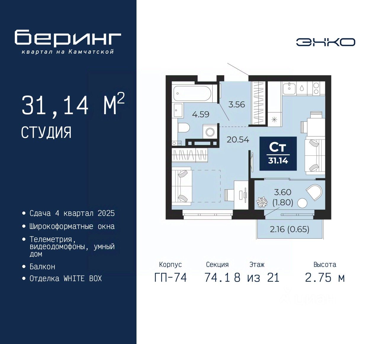 1-комн. квартира-студия в ЖК "Беринг" на 8 этаже. Квартира без отделки, после оформления собственности можно делать ремонт. Общая площадь: 31.14 кв.м., площадь гостиной 20.54 кв.м., из которых 5 кв.м. выделено под кухонную зону. Все окна выходят на одну сторону. В квартире один балкон, один совмещенный санузел. Высота потолков 2.75 м.