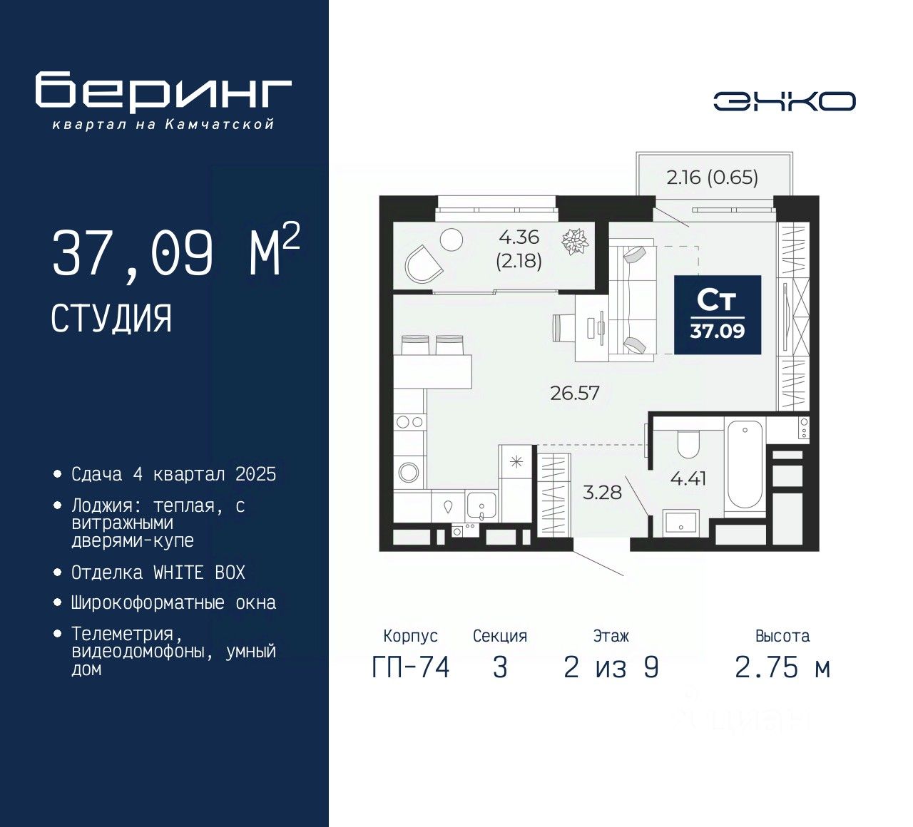 Однокомнатная квартира-студия от застройщика в ЖК "Беринг" на 2 этаже. Квартира без отделки, после выдачи ключей можно делать ремонт. Общая площадь: 37.09 кв.м., площадь гостиной 26.57 кв.м., из которых 5 кв.м. выделено под кухонную зону. Все окна выходят на одну сторону. В квартире один балкон и одна лоджия, один совмещенный санузел. Высота потолков 2.75 м.