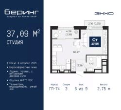 Просторная 1-комн. квартира-студия в ЖК "Беринг" на 6 этаже. Квартира без отделки, после оформления собственности можно делать ремонт. Общая площадь: 37.09 кв.м., площадь гостиной 26.57 кв.м., из которых 5 кв.м. выделено под кухонную зону. Все окна выходят на одну сторону. В квартире один балкон и одна лоджия, один совмещенный санузел. Высота потолков 2.75 м.