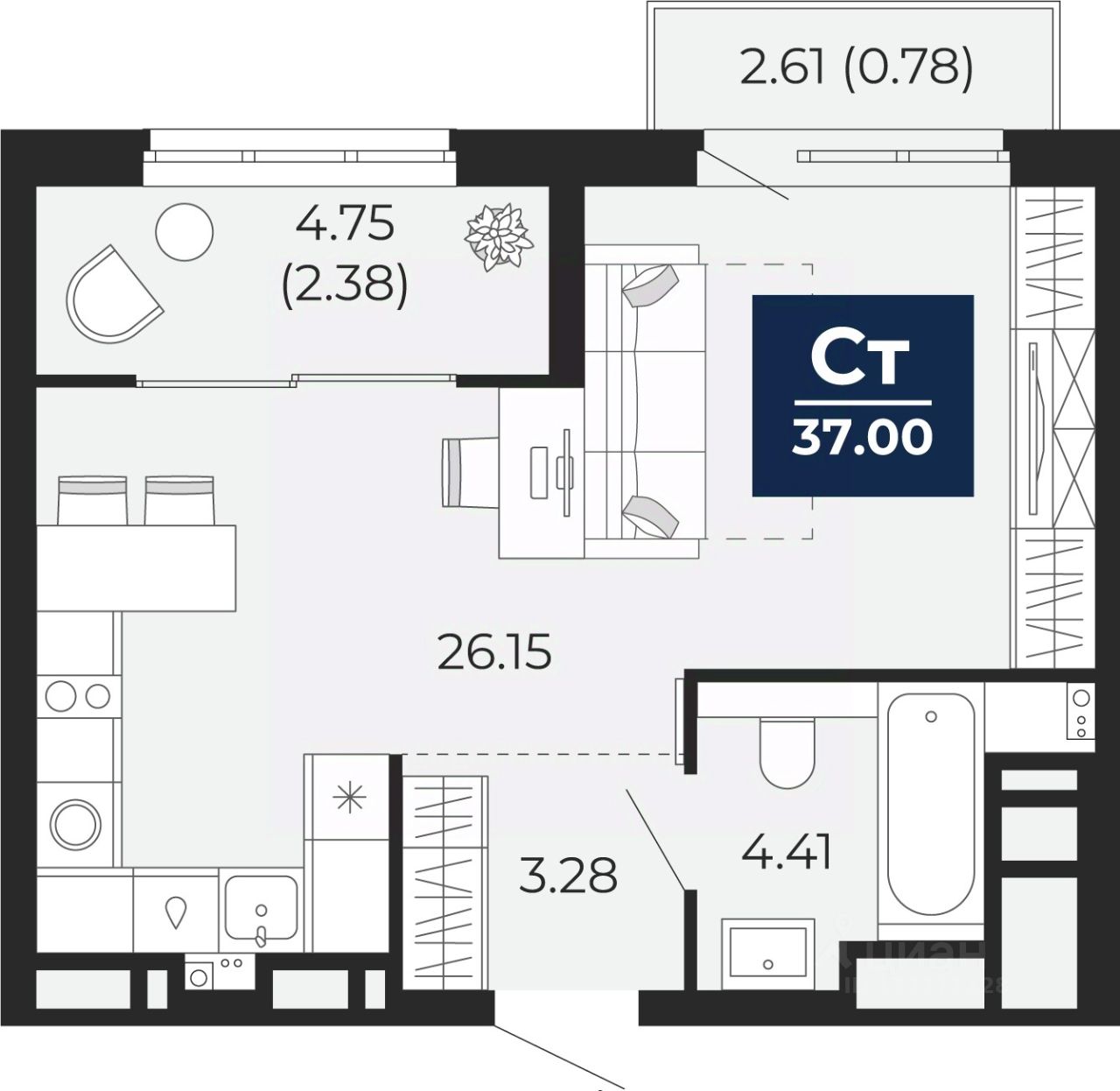 1-комн. квартира-студия от застройщика в ЖК "Беринг" на 5 этаже. Квартира без отделки, после выдачи ключей можно делать ремонт. Общая площадь: 37 кв.м., площадь гостиной 26.15 кв.м., из которых 5 кв.м. выделено под кухонную зону. Все окна выходят на одну сторону. В квартире один балкон, один совмещенный санузел. Высота потолков 2.75 м.