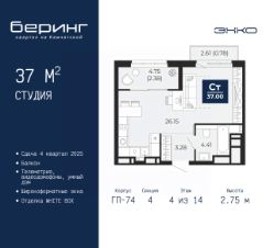 Продается 1-комн. квартира-студия в ЖК "Беринг" на 4 этаже. Квартира без отделки, полностью готова к ремонту. Общая площадь: 37 кв.м., площадь гостиной 26.15 кв.м., из которых 5 кв.м. выделено под кухонную зону. Все окна выходят на одну сторону. В квартире один балкон, один совмещенный санузел. Высота потолков 2.75 м.