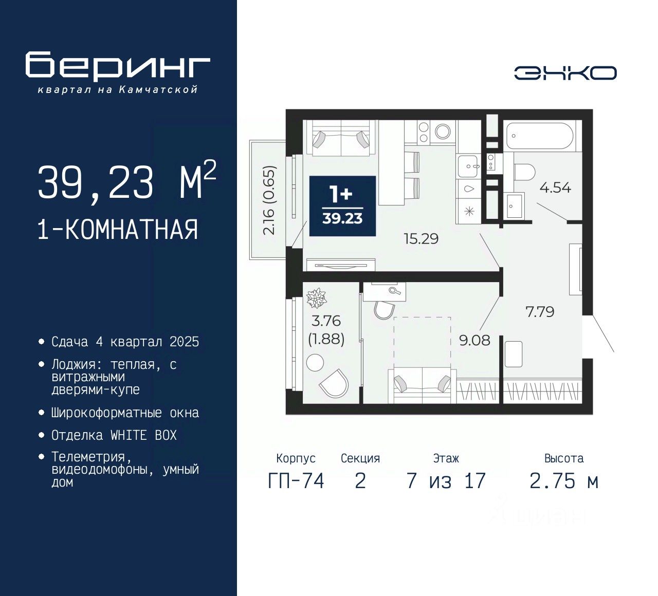 Просторная однокомнатная квартира в ЖК "Беринг" на 7 этаже. Квартира без отделки, полностью готова к чистовой отделке и дальнейшему ремонту. Общая площадь: 39.23 кв.м., жилая: 9.08 кв.м., площадь просторной кухни-столовой: 15.29 кв.м. Все окна выходят на одну сторону. В квартире один балкон и одна лоджия, один совмещенный санузел. Высота потолков 2.75 м.