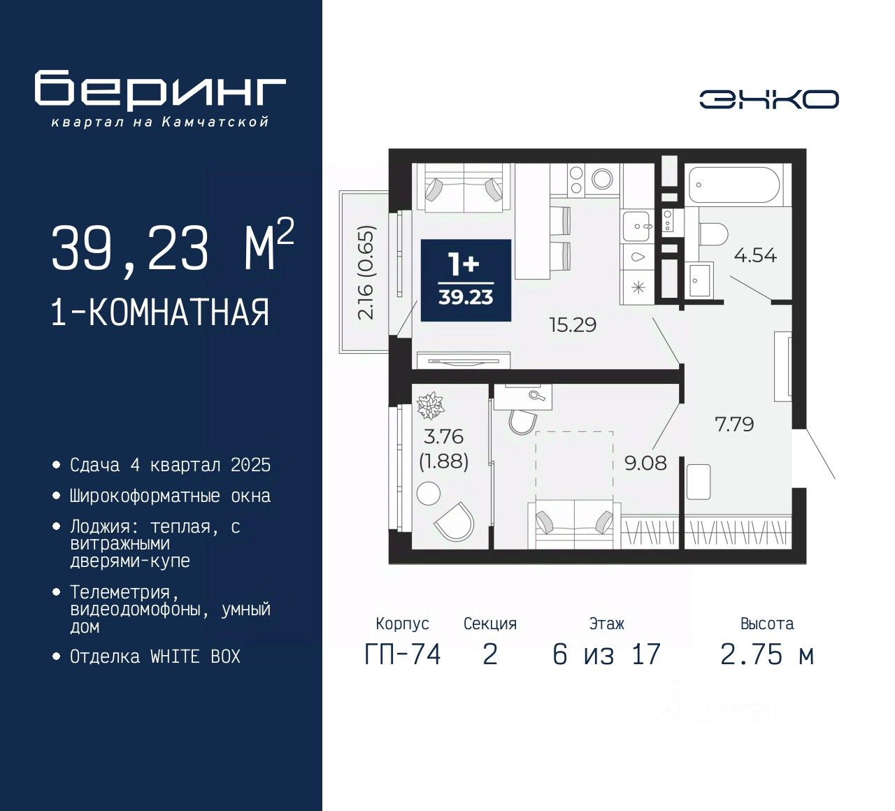 Продается 1-комн. квартира в ЖК "Беринг" на 6 этаже. Квартира без отделки, после получения ключей можно делать ремонт. Общая площадь: 39.23 кв.м., жилая: 9.08 кв.м., площадь просторной кухни-столовой: 15.29 кв.м. Все окна выходят на одну сторону. В квартире один балкон и одна лоджия, один совмещенный санузел. Высота потолков 2.75 м.