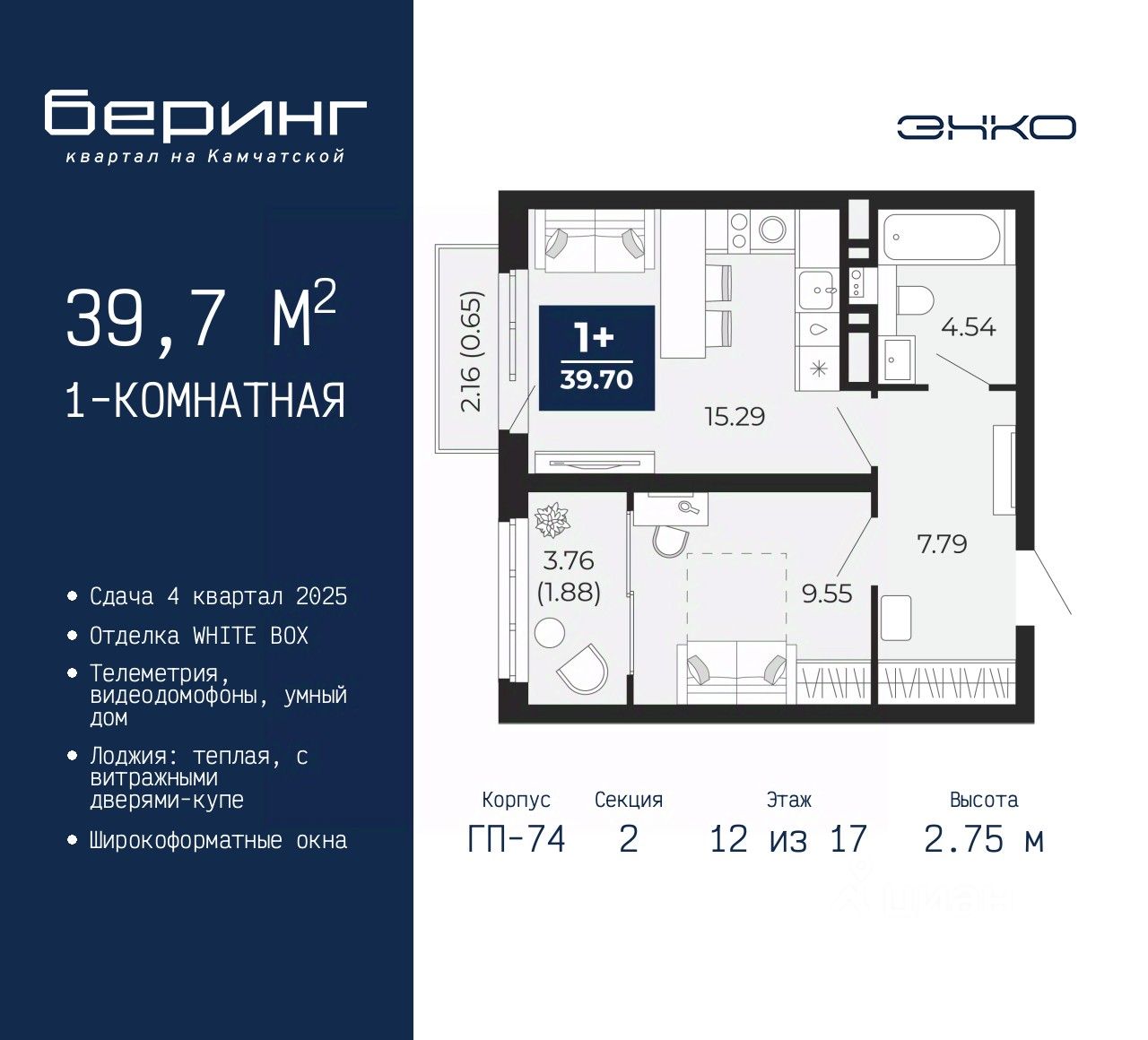 Однокомнатная квартира в ЖК "Беринг" на 12 этаже. Квартира без отделки, полностью готова к ремонту. Общая площадь: 39.7 кв.м., жилая: 9.55 кв.м., площадь просторной кухни-столовой: 15.29 кв.м. Все окна выходят на одну сторону. В квартире один балкон и одна лоджия, один совмещенный санузел. Высота потолков 2.75 м.