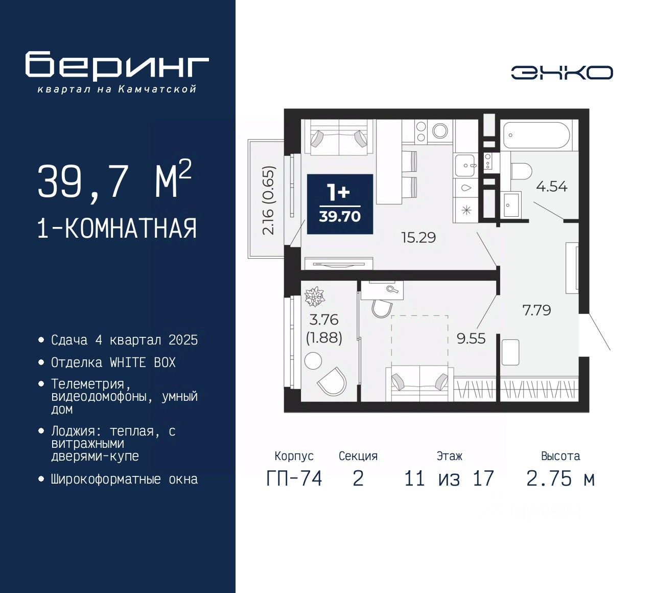Однокомнатная квартира в ЖК "Беринг" на 11 этаже. Квартира без отделки, полностью готова к чистовой отделке и дальнейшему ремонту. Общая площадь: 39.7 кв.м., жилая: 9.55 кв.м., площадь просторной кухни-столовой: 15.29 кв.м. Все окна выходят на одну сторону. В квартире один балкон и одна лоджия, один совмещенный санузел. Высота потолков 2.75 м.