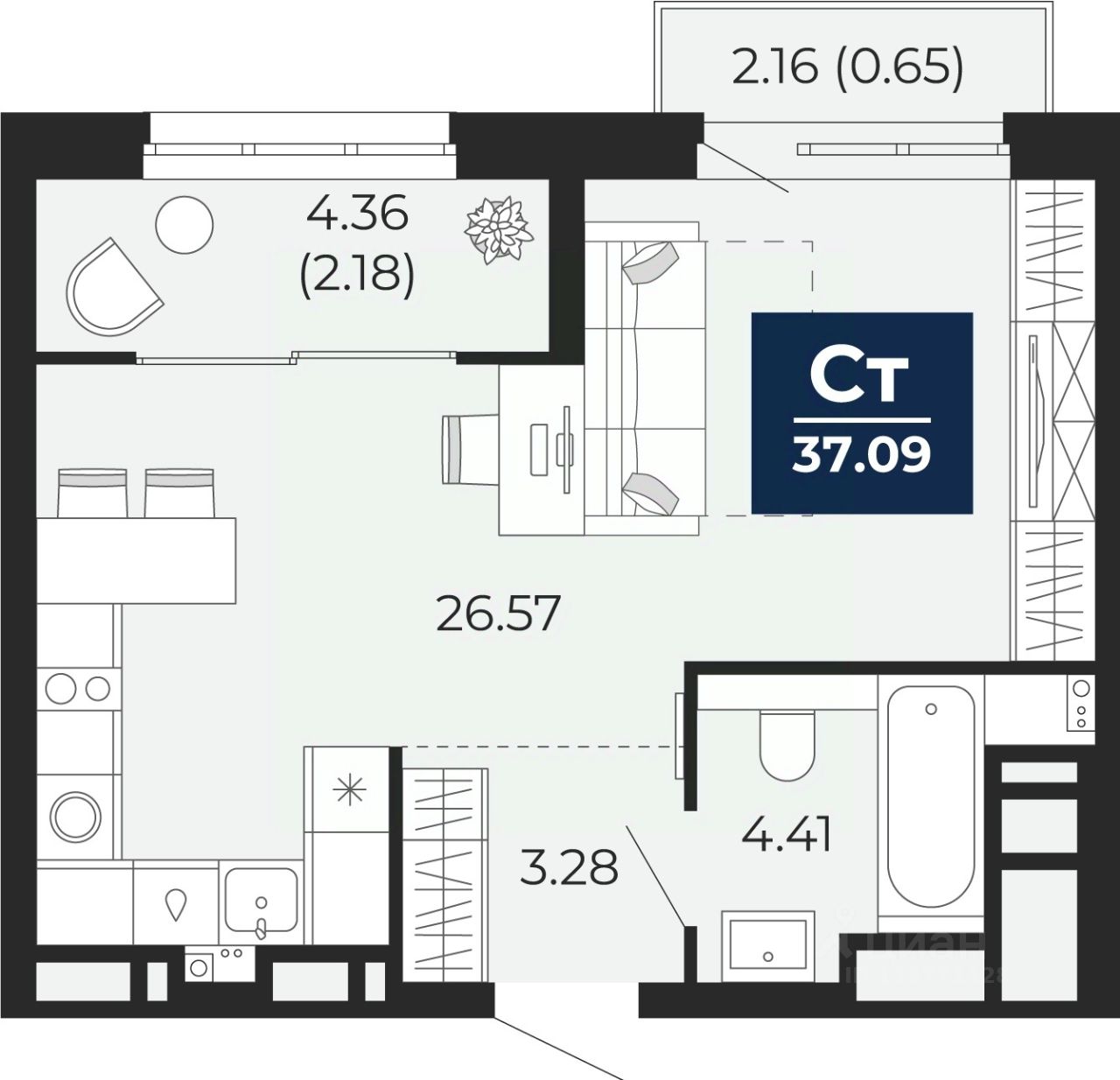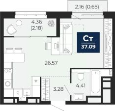 1-комн. квартира-студия от застройщика в ЖК "Беринг" на 9 этаже. Квартира без отделки, новый собственник может сделать ремонт по своему дизайн-проекту. Общая площадь: 37.09 кв.м., площадь гостиной 26.57 кв.м., из которых 5 кв.м. выделено под кухонную зону. Все окна выходят на одну сторону. В квартире один балкон и одна лоджия, один совмещенный санузел. Высота потолков 2.75 м.