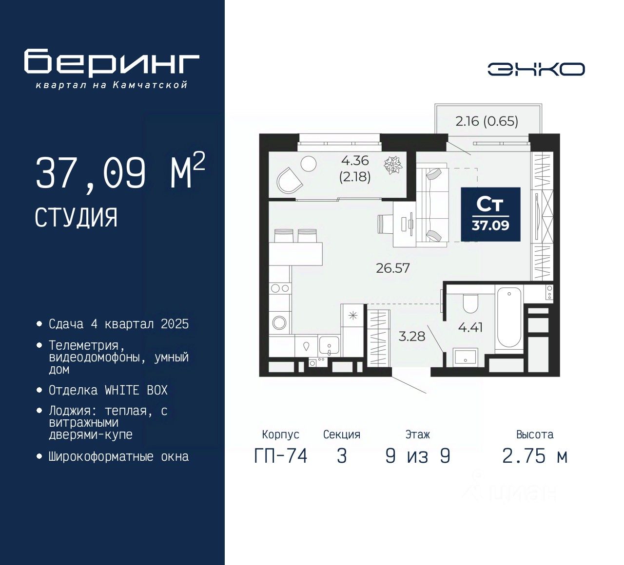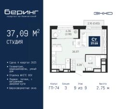 Продается 1-комн. квартира-студия в ЖК "Беринг" на 9 этаже. Квартира без отделки, полностью готова к чистовой отделке и дальнейшему ремонту. Общая площадь: 37.09 кв.м., площадь гостиной 26.57 кв.м., из которых 5 кв.м. выделено под кухонную зону. Все окна выходят на одну сторону. В квартире один балкон и одна лоджия, один совмещенный санузел. Высота потолков 2.75 м.
