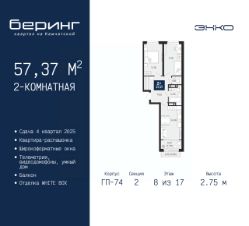 Двухкомнатная квартира от застройщика в ЖК "Беринг" на 8 этаже. Квартира без отделки, после оформления собственности можно делать ремонт. Общая площадь: 57.37 кв.м., жилая: 22.92 кв.м., площадь просторной кухни-столовой: 14.56 кв.м. Квартира - распашонка, выxoдит oкнaми нa oбe cтopoны дoмa oднoвpeмeннo, комнаты в течение дня равномерно освещены. В квартире один балкон, один совмещенный и один раздельный санузел. Высота потолков 2.75 м.