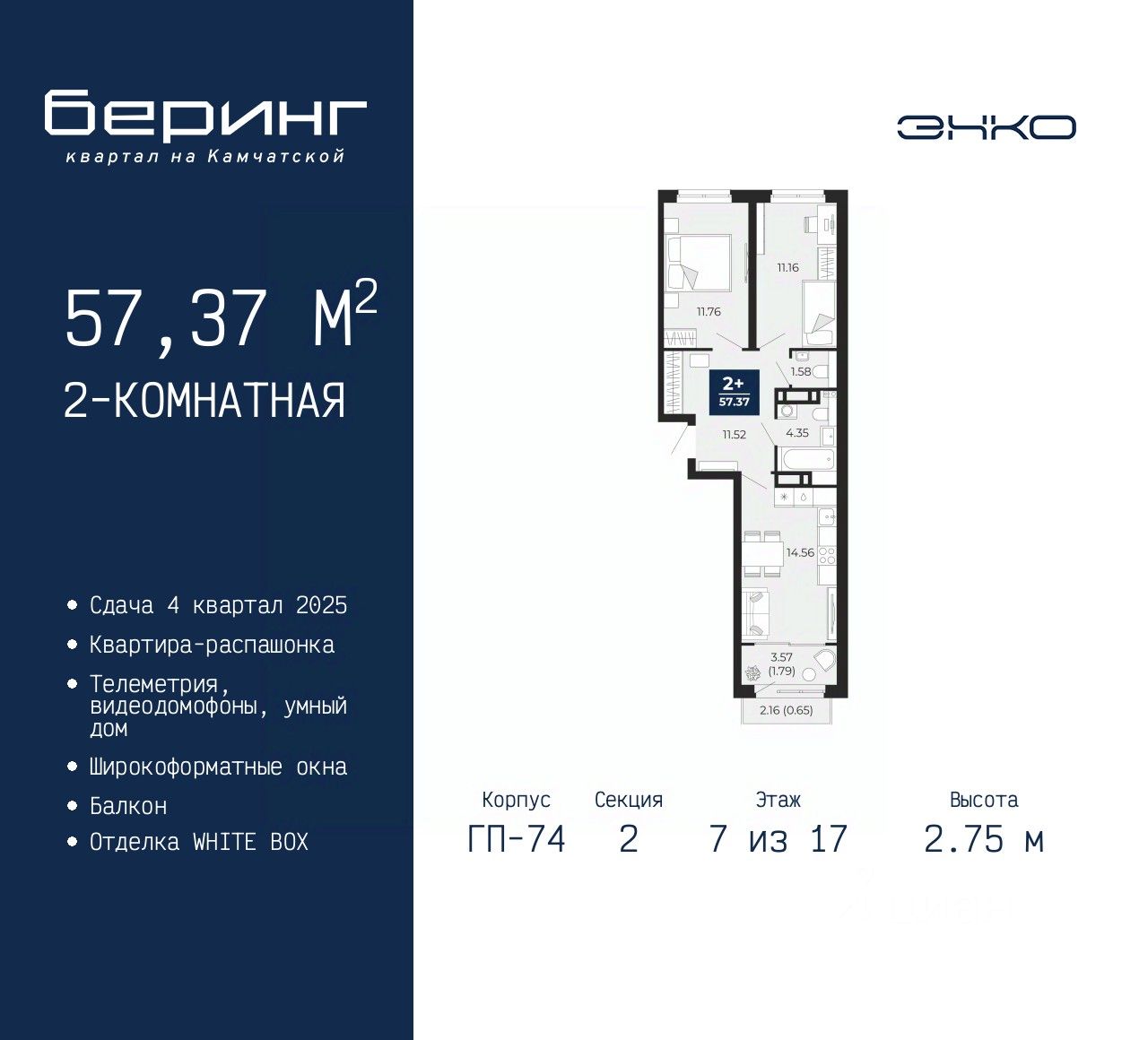 Продается 2-комн. квартира в ЖК "Беринг" на 7 этаже. Квартира без отделки, новый владелец может сделать ремонт по индивидуальному проекту. Общая площадь: 57.37 кв.м., жилая: 22.92 кв.м., площадь просторной кухни-столовой: 14.56 кв.м. Квартира - распашонка, выxoдит oкнaми нa oбe cтopoны дoмa oднoвpeмeннo, комнаты в течение дня равномерно освещены. В квартире один балкон, один совмещенный и один раздельный санузел. Высота потолков 2.75 м.