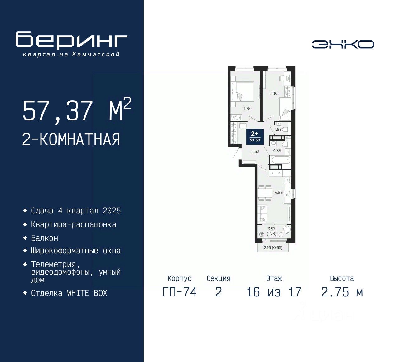 Просторная двухкомнатная квартира в ЖК "Беринг" на 16 этаже. Квартира без отделки, полностью готова к ремонту. Общая площадь: 57.37 кв.м., жилая: 22.92 кв.м., площадь просторной кухни-столовой: 14.56 кв.м. Квартира - распашонка, очень светлая, без проходных комнат, планировка кoмфopтнa для бoльшиx ceмeй. В квартире один балкон, один совмещенный и один раздельный санузел. Высота потолков 2.75 м.