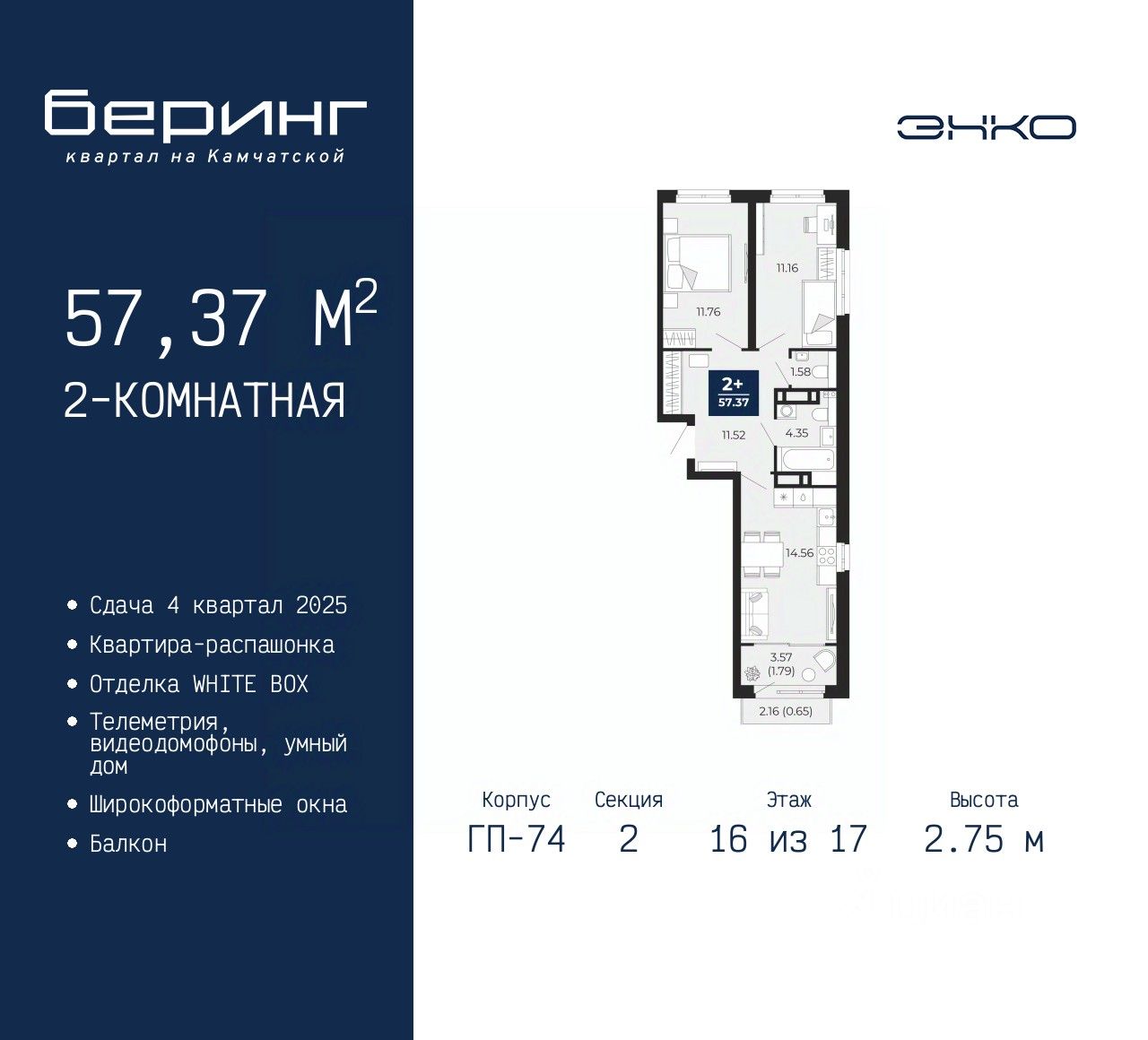 Продается 2-комн. квартира в ЖК "Беринг" на 16 этаже. Квартира без отделки, после оформления собственности можно делать ремонт. Общая площадь: 57.37 кв.м., жилая: 22.92 кв.м., площадь просторной кухни-столовой: 14.56 кв.м. Квартира - распашонка, без проходных комнат, окна выходят на paзные стороны дома. В квартире один балкон, один совмещенный и один раздельный санузел. Высота потолков 2.75 м.