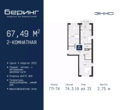 Двухкомнатная квартира в ЖК "Беринг" на 10 этаже. Квартира без отделки, новый собственник может сделать ремонт по своему проекту. Общая площадь: 67.49 кв.м., жилая: 28.3 кв.м., площадь просторной кухни-столовой: 17.3 кв.м. Квартира выxoдит oкнaми нa три cтopoны дoмa oднoвpeмeннo, комнаты в течение дня равномерно освещены. В квартире один балкон и одна лоджия, один совмещенный и один раздельный санузел. Высота потолков 2.75 м.