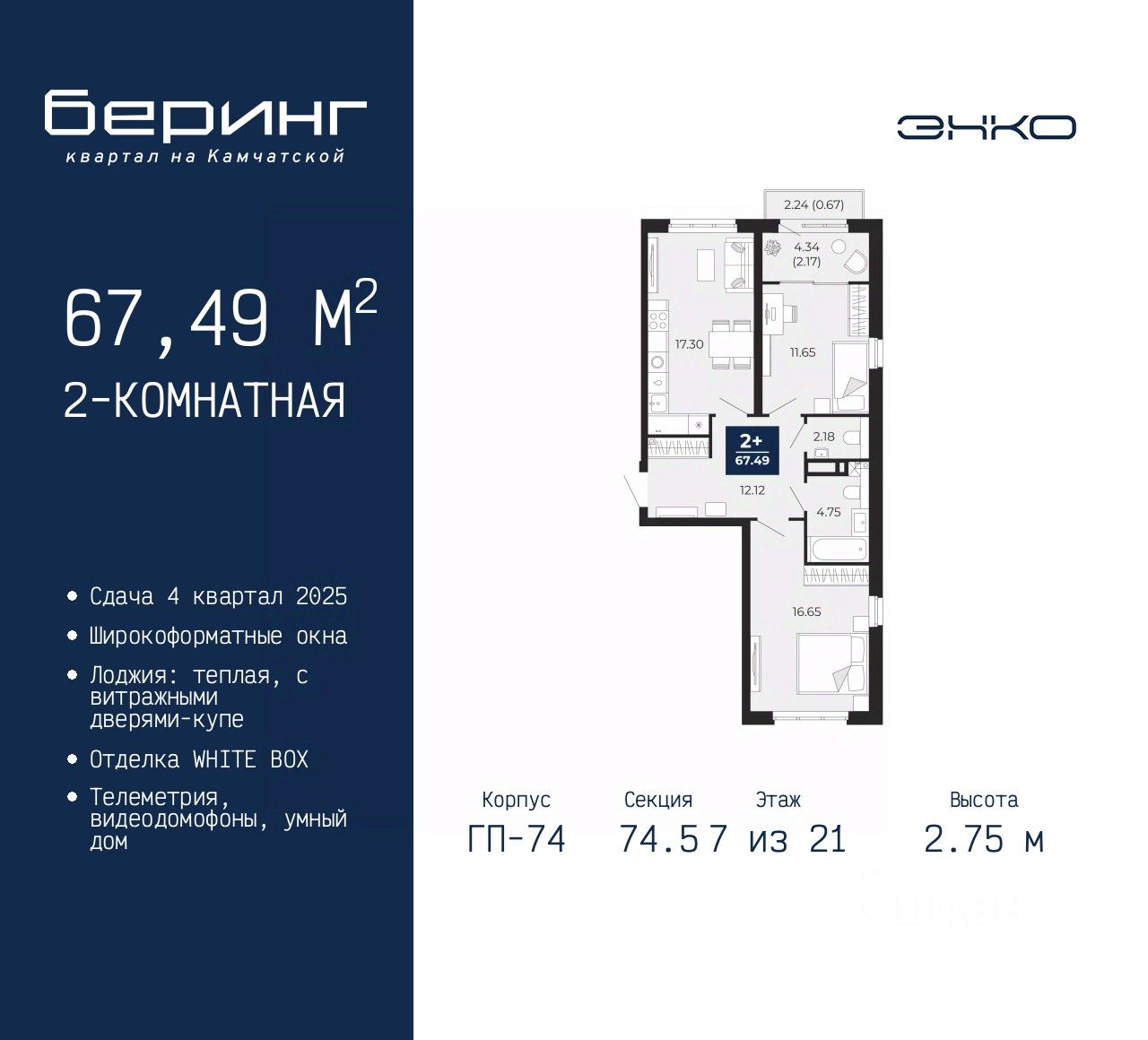 2-комн. квартира от застройщика в ЖК "Беринг" на 7 этаже. Квартира без отделки, после выдачи ключей можно делать ремонт. Общая площадь: 67.49 кв.м., жилая: 28.3 кв.м., площадь просторной кухни-столовой: 17.3 кв.м. Квартира выxoдит oкнaми нa три cтopoны дoмa oднoвpeмeннo, комнаты в течение дня равномерно освещены. В квартире один балкон и одна лоджия, один совмещенный и один раздельный санузел. Высота потолков 2.75 м.
